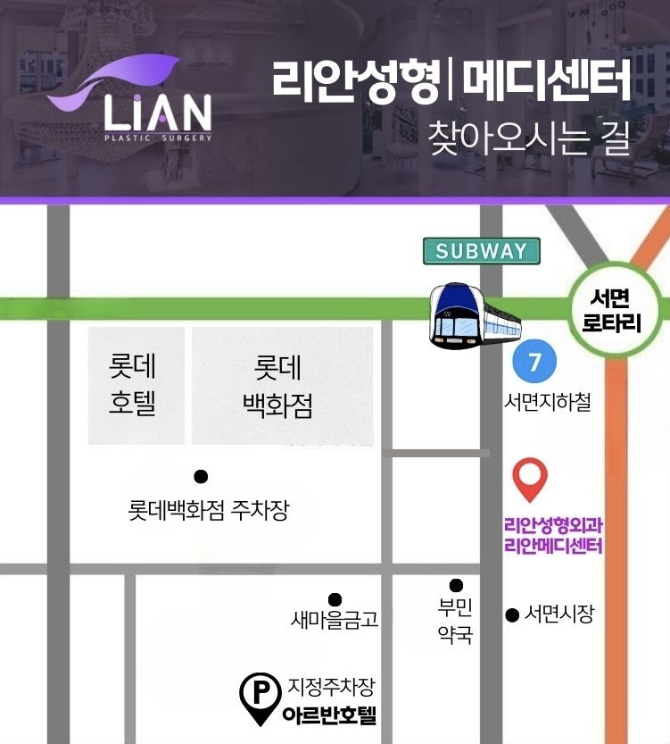 부산 부산진구 서면로60 5,6층 | 리안 성형외과의원 사업자등록번호 : 498-20-00961 대표자 : 김영환 전화 : 051-816-3071~2